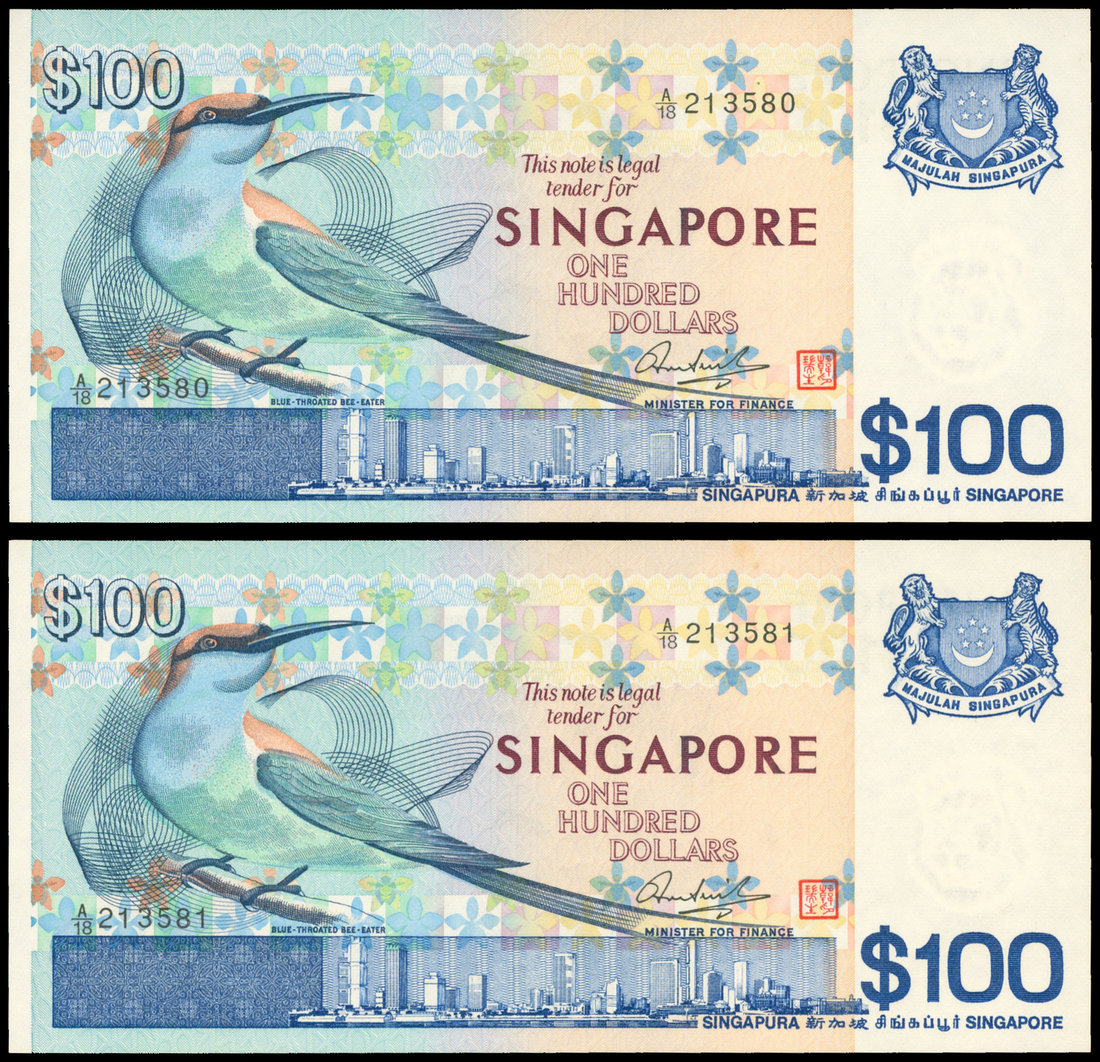 Singapore, consecutive pair of $100, 1977, serial number A/18 213580-81, blue on multicolour underprint, arms at upper right, watermark of lion's head at right, various ethnic dancers on reverse,