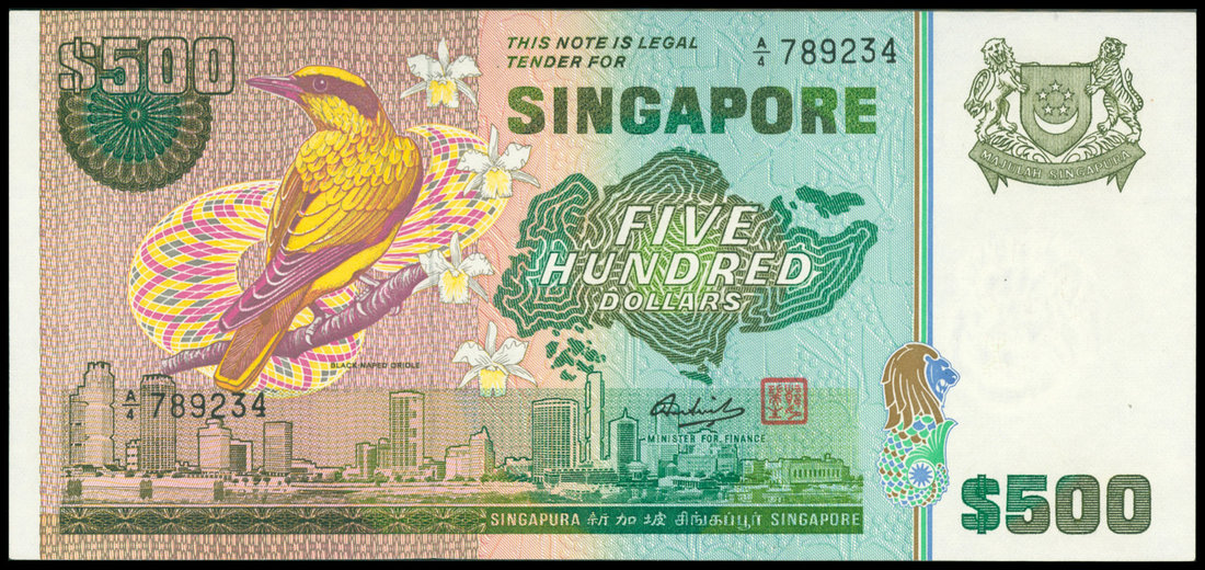 Singapore, $500, 1977, serial number A/4 789234, the 'Bird' series, purple and turquois on multicolour, black naped oriole at left,
