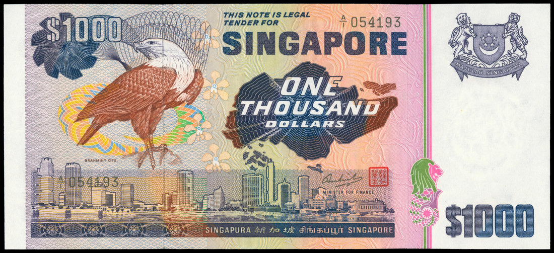 Singapore, $1000, ND (1978), serial number A/1 054193, violet and brown on multicolour underprint, bied at left, city skyline at bottom, arms at upper right,