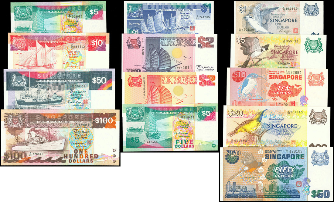 Singapore lot of 13 notes, 'Bird series' $1, $5, $10, $20 and $50, 'Ship series', $1, $2 (3 different) $5 (2 pieces, one with the A/1 prefix and one with the Z/1 prefix), $10, $50 and $100,