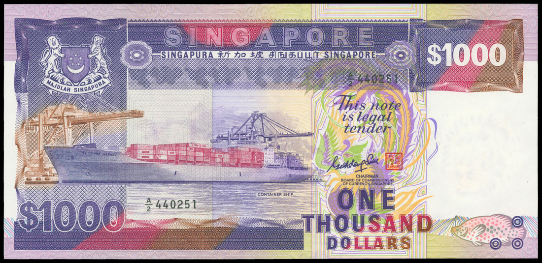 Singapore, $1000, 1984, serial number A/2 440251, the 'Boat' series, purple on multiclour, container ship at left, lion watermark at right,