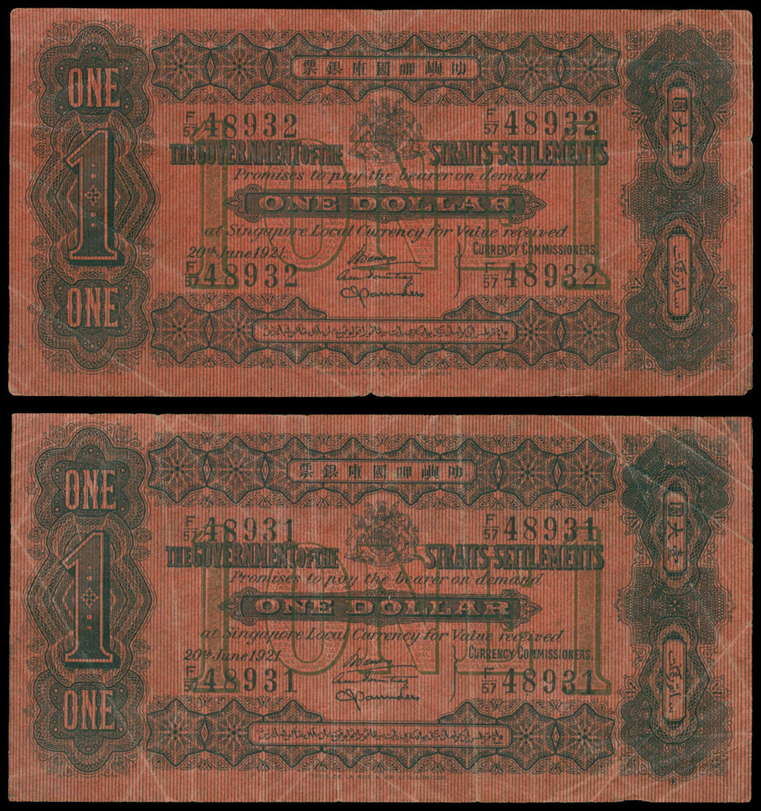 Straits Settlements, a consecutive pair of $1, 20.6.1921, serial numbers F/57 48931 and F/57 48932, black on dark red paper, arms at upper centre, reverse shows a tiger at centre,