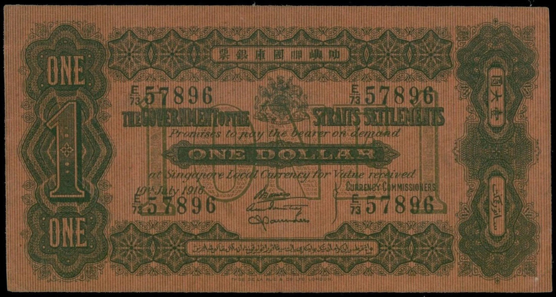 Straits Settlements, $1, 10.7.1916, serial number E/73 57896, black, arms at upper centre, reverse black, tiger at centre,