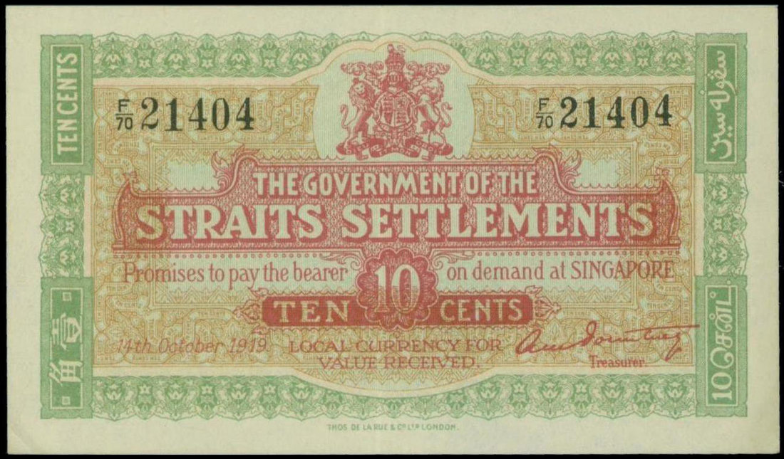 Straits Settlements, 10 cents, 1919, serial number F/70 21404, green on pale orange and red, coat of arms top centre, Chinese, English, Tamil and Malay script at each corner, reverse green, dragon at centre,