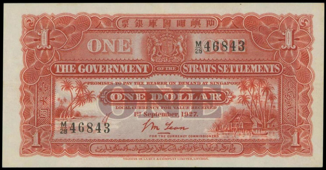 Strait Settlements, $1. 1.9.1927, serial number M28/ 46843, red on grey-violet underprint, palm trees at left, palm trees and huts at right, 4 signature varieties (red and black), back: beach with palms at center,