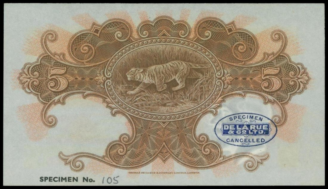 Straits Settlements, $5, progressive proof of the reverse ND (1925-30), hand written specimen number 105, brown and orange, tiger in ornate cartouche at upper centre, blue DLR seal, reverse orange and yellow,