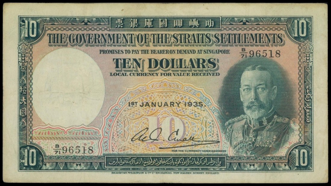 Straits Settlements, $10, 1.1.1935, serial number B/71 96518, green, King George V at right, reverse green, tiger at centre, woman's head at left,