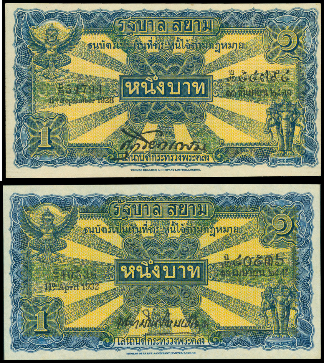 Thailand, pair of 1 baht, 1928 and 1932, serial number D/70 54794 and G/70 40536, blue on yellow underprint, Ceremonial procession on reverse,