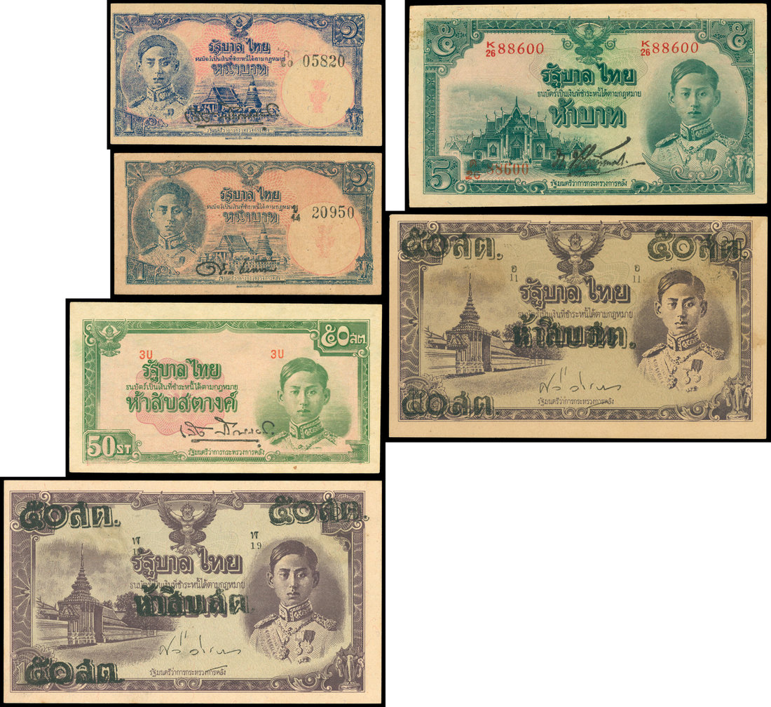 Thailand, set of 6 notes, 1940's, 50 satang 1942 (1), 1946 (2), 1 baht 1945 (2), and 5 baht 1945, serial number K26 88600 (1), featuring Rama VIII,