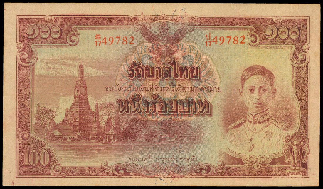 Thailand, 100 baht, no date (1945), serial number S/17 49782, red, Rama VIII at right, Temple of the Dawn at left, reverse blue, temple at centre,