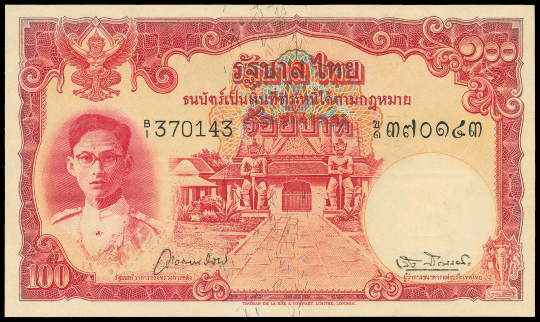 Thailand, 100 baht, ND (1948), serial number B/1 370143, red on multicolour underprint, portrait of king at left, blue and red security threads, watermark at right,
