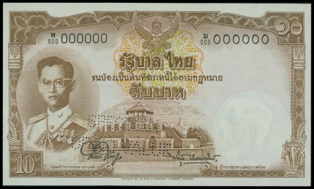 Thailand, 10 baht, specimen, ND (1953), serial number W/000 000000, brown on multicolour underprint, protrait at left, perforated “SPECIMEN OF NO VALUE”