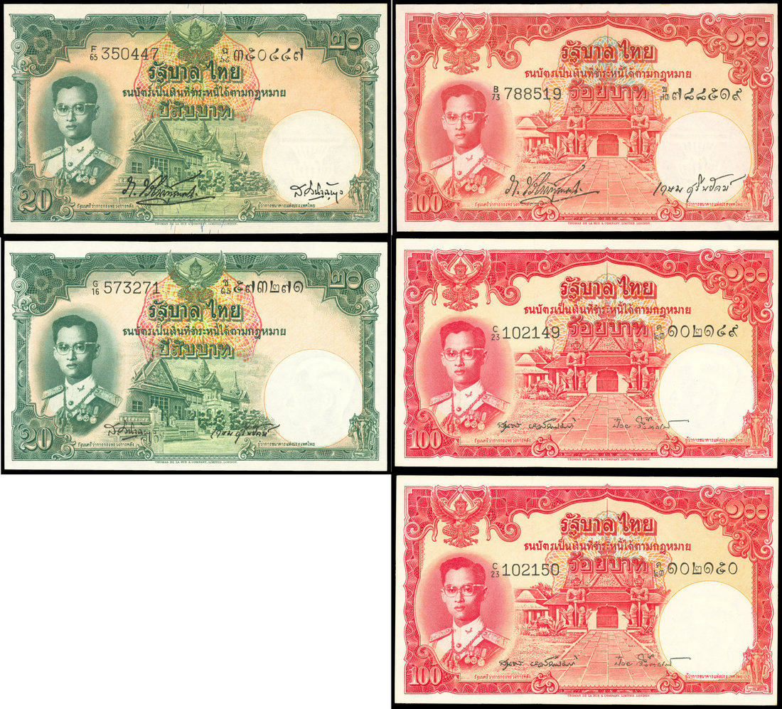 Thailand, set of 5 notes, 1953 and 1955, 20 baht (2) and 100 baht (3), green and red respectively, King Rama IX at left, consecutive pair of 100 baht,