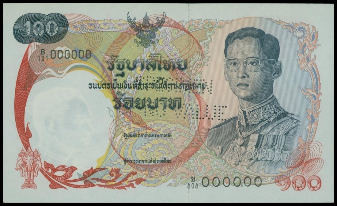 Thailand, 100 baht, specimen, ND (1968), serial number B/101 000000, red, blue and multicolour, Roma IX at right, perforated “SPECIMEN OF NO VALUE”,