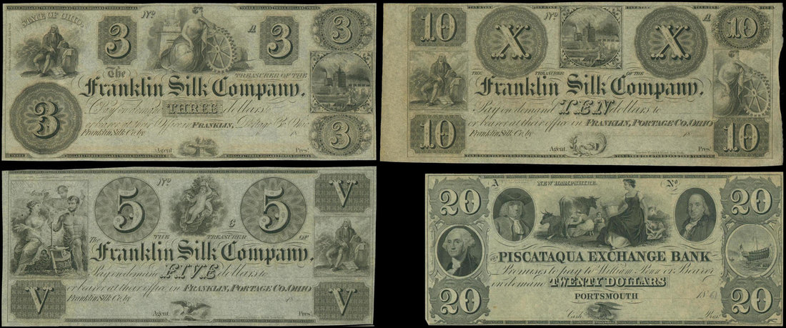 Franklin Silk Company, a group group of 3 remainders for $3, $5 and $10, Ohio, undated (18xx), also The Piscataqua Exchange Bank, $20 remainder, Portsmouth, undated (186x),