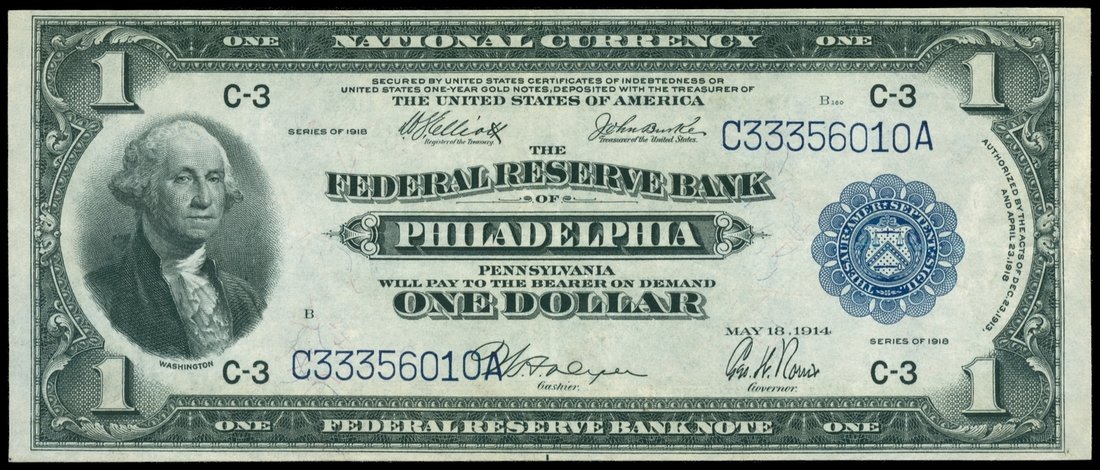 U.S.A., National Currency $1, 1914, Philadelphia, serial number C33356010A, black and blue seal, Washington at left,reverse green, eagle at centre,