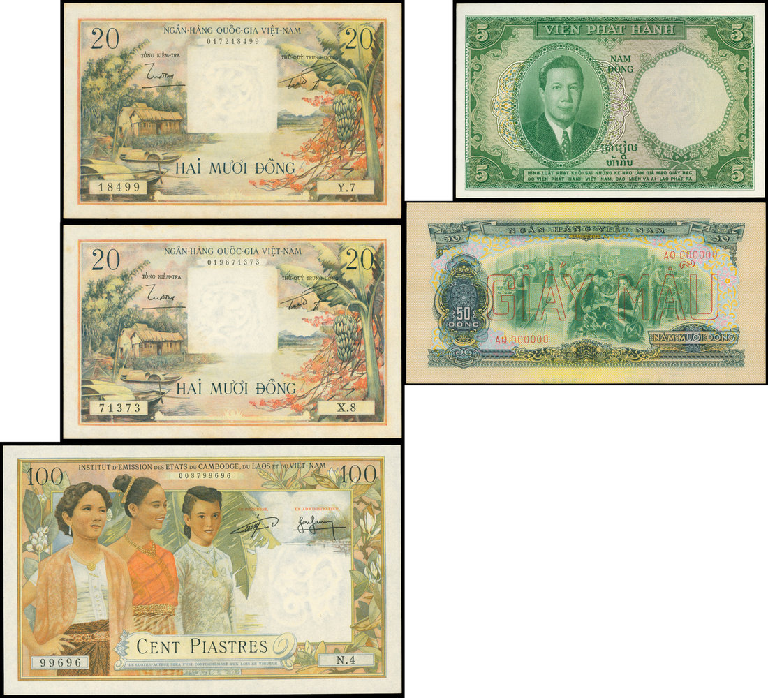 South Viet Nam and French Indo-China, set of 5 notes, 1953-56, 5 dong, 20 dong (2) and 100 dong of the first issue, also National Bank, 50 dong specimen, 1966,