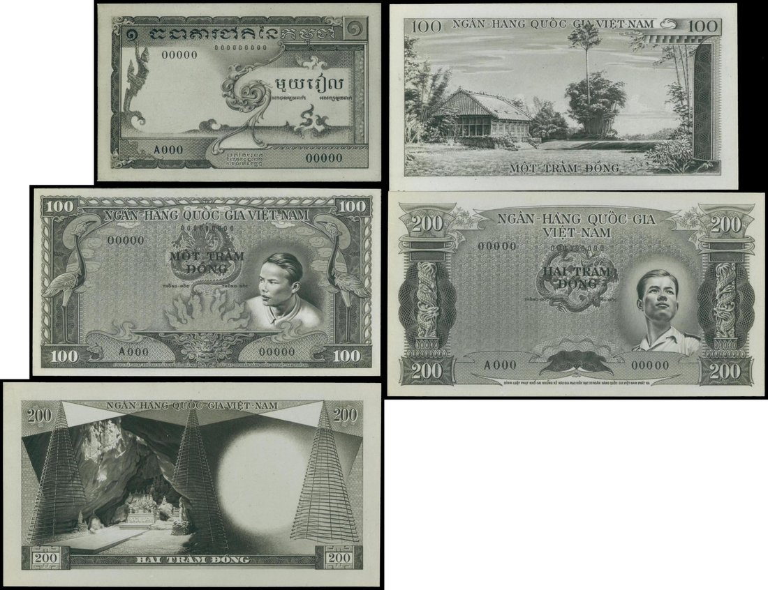 Cambodia and Vietnam, a set of 5 archival photos of prosed designs for: 1 piastre (obverse only) and 100 and 200 dong (obverse and reverse pair), no date, but stamped 'DLR STUDIO PHOTOGRAPHED 21 JAN 1955', all of these are unissed designs