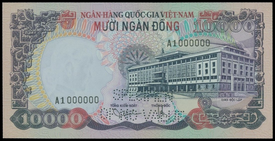 Viet Nam-South, 10000 dong, specimen, ND (1975), serial number A1 000000, violet and multicolour, Palace of Independence at right, water buffalo on reverse, perforated “SPECIMEN OF NO VALUE”,