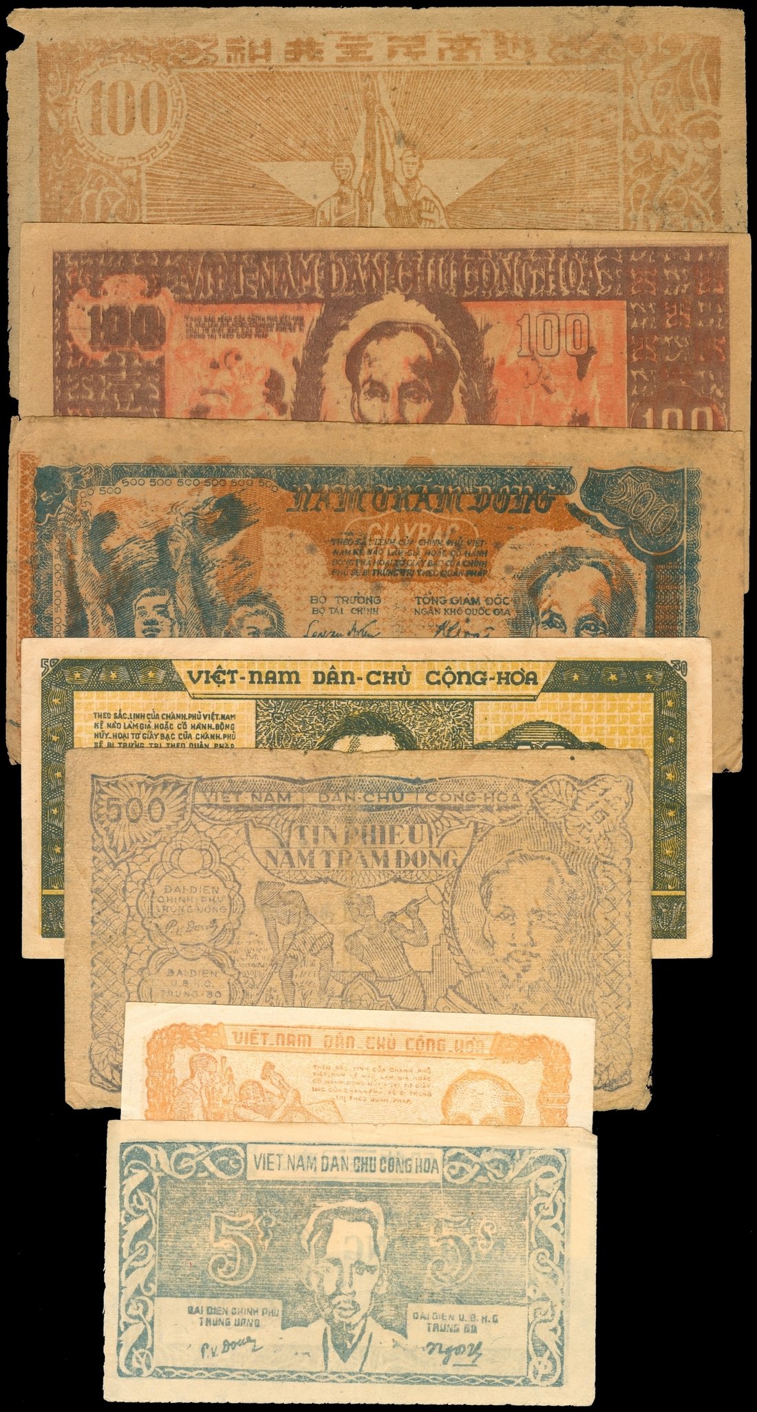 North Viet Nam, set of 7 notes, wartime issues 1940's early 1950's, 5, 10, 50, 100 (2) and 500 (2) dong,