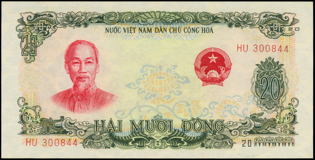 Viet Nam, 20 dong, ND (1969), serial number HU300844, Oleve on dark green underprint, HCM at left, coat of arms at right, tractor on reverse, unissued,