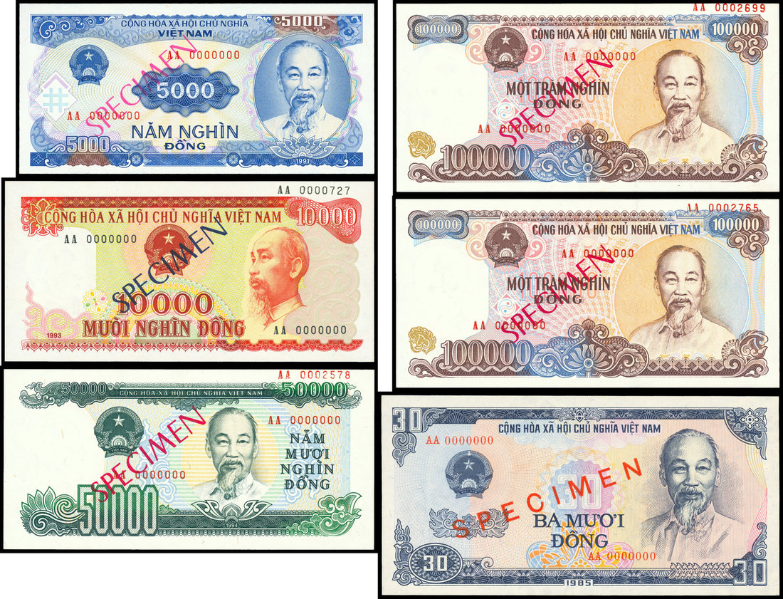 Viet Nam, Set of 6 specimens, 30, 5000, 10000 (3) and 50000 dong, portrait at right, ‘SPECIMEN’ overprinted,