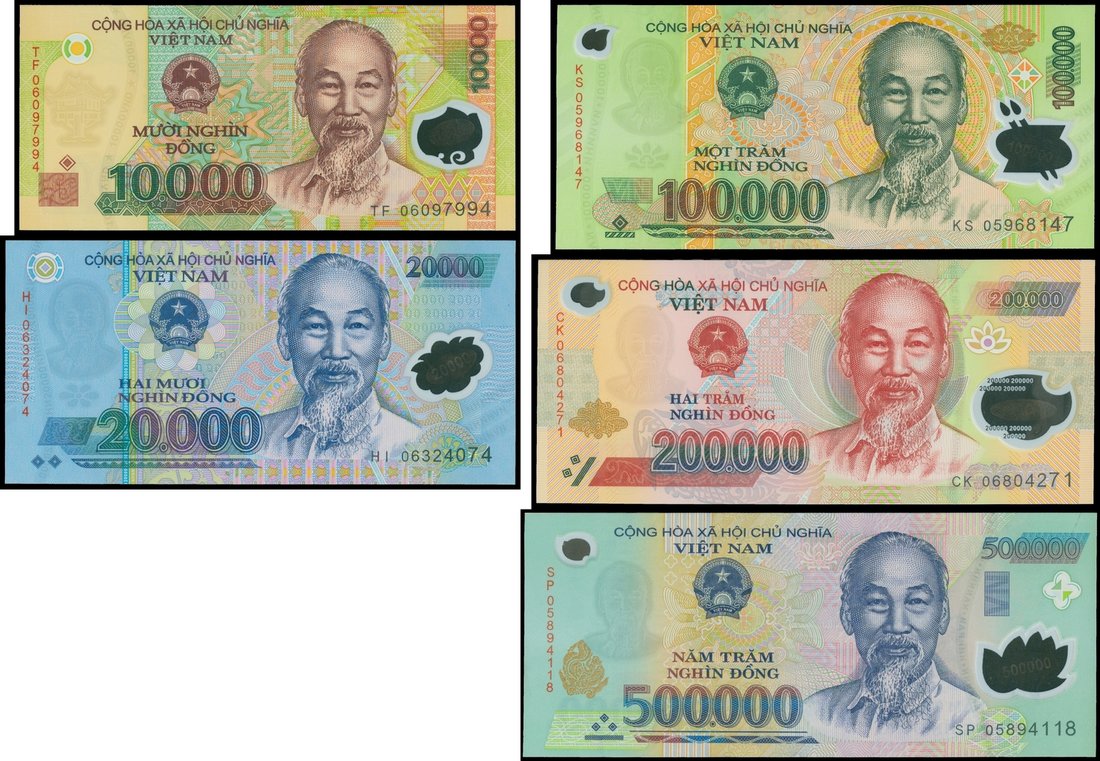 Vietnam, State Bank, a complete set of 6 polymer 'Pick Plate Plate' notes, 10000, 20000, 50000, 100000, 200000 and 500000 dong, 2005-2006, serial number TF06097994, HI06324074, DL05555023, KS05968147, CK06804271 and SP05894118, predominant colour orange, blue, green and red, Ho Chi Minh at right, arms at left, varying landmarks on reverse,
