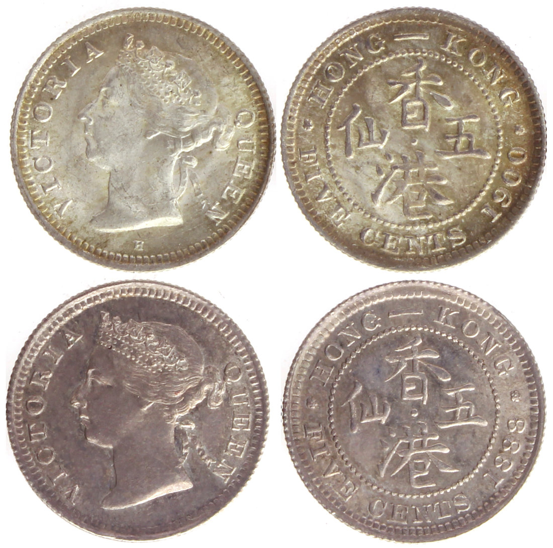 Hong Kong, a pair of silver 5 cents, 1888 and 1900H, Victoria on obverse,