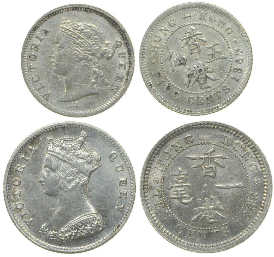 Hong Kong, a lot of 2 silver coins, 5 cents, 1867 and 10 cents, 1868, Queen Victoria on the obverse,