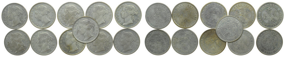 Hong Kong, lot of 11 coins, silver 20 cents, 1887 to 1895, bust of Victoria on obverse,