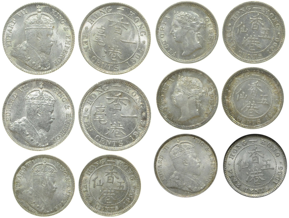 Hong Kong, a lot of 6 silver fractional coins, 5 cents, (1891, 1900H, 1905 x2) and 10 cents (1902, 1904),