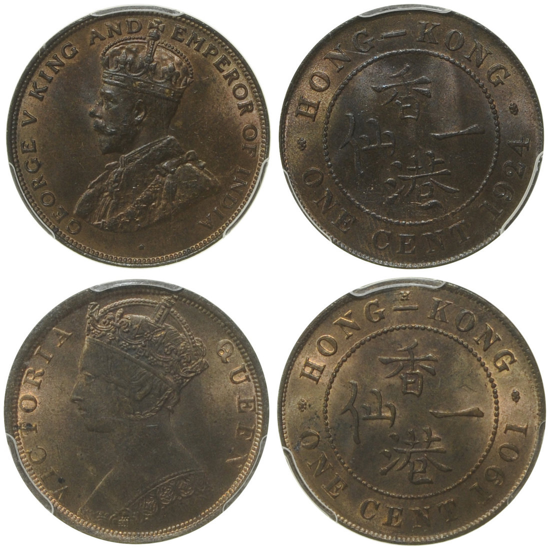 Hong Kong, a lot of 2 coins, bronze 1 cent, 1901-H and 1924,