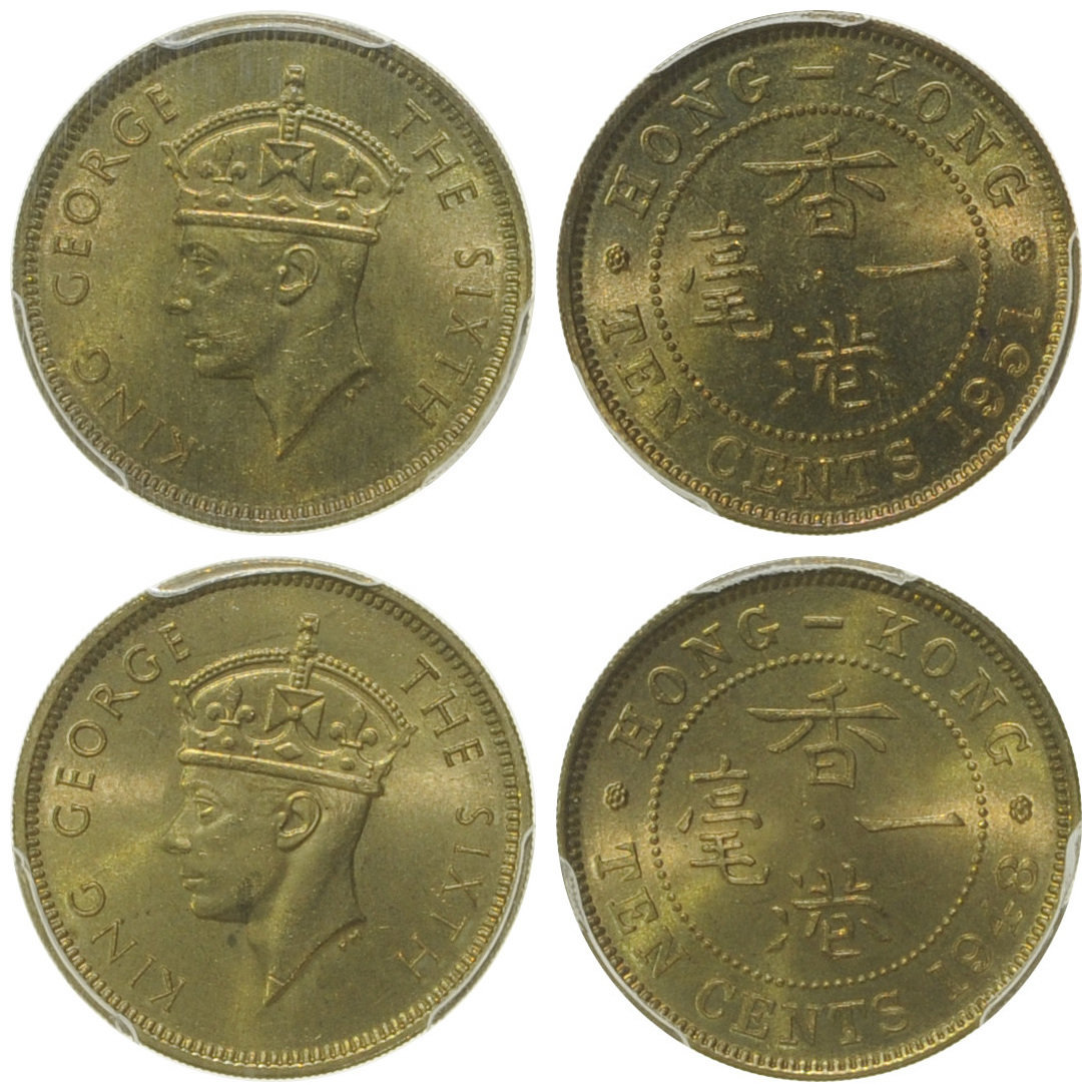 Hong Kong, a lot of 2 coins, 10 cents, 1948, 1951, bust of George VI on obverse,