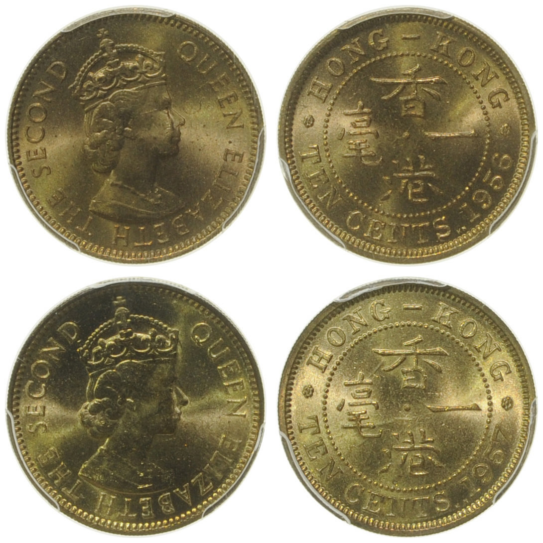 Hong Kong, a lot of 2 coins, 10 cents, 1956-KN, 1957-KN, bust of Elizabeth II on obverse,