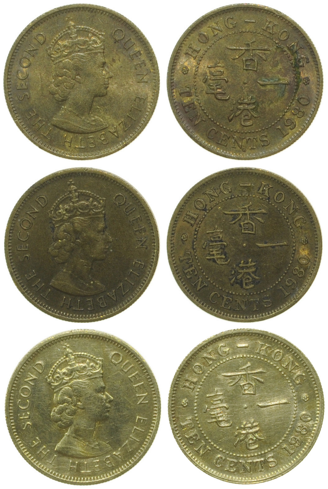 Hong Kong, group of 3x 10cents, 1980, key date of the Queen Elizabeth issue, very fine to extremely fine.(3)