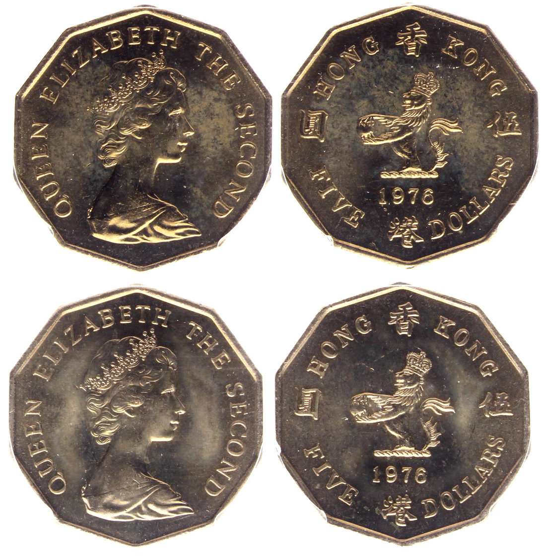 Hong Kong, a lot of 2 coins, a pair of $5, both 1976, Queen Elizabeth on obverse,
