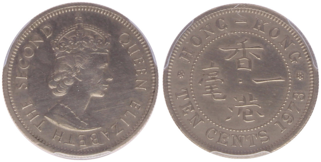 Hong Kong, 10 cents, 1973, ERROR COIN, struck in cupro nickel instead of brass,
