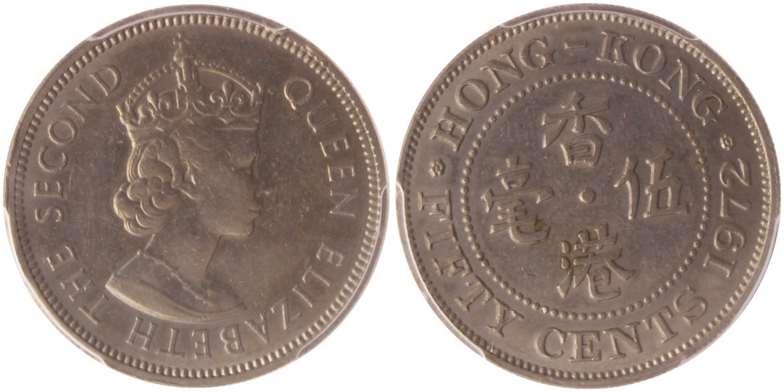 Hong Kong, copper nickel 50 cents, 1972, mint error, split planchet-hinged, weight 5.9gm, Elizabeth II on obverse,