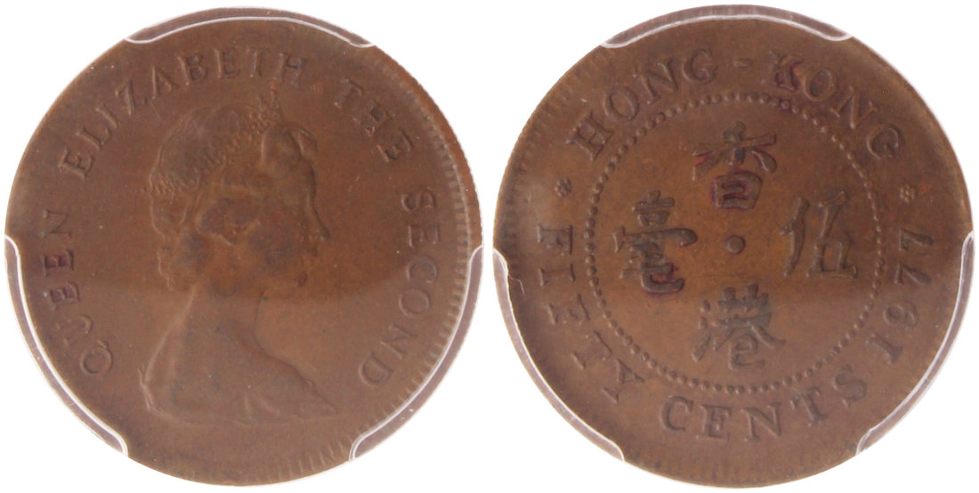 Hong Kong, 50 cents, 1977, mint error, struck on copper planchet, weight 3.6gm, Elizabeth II on obverse,