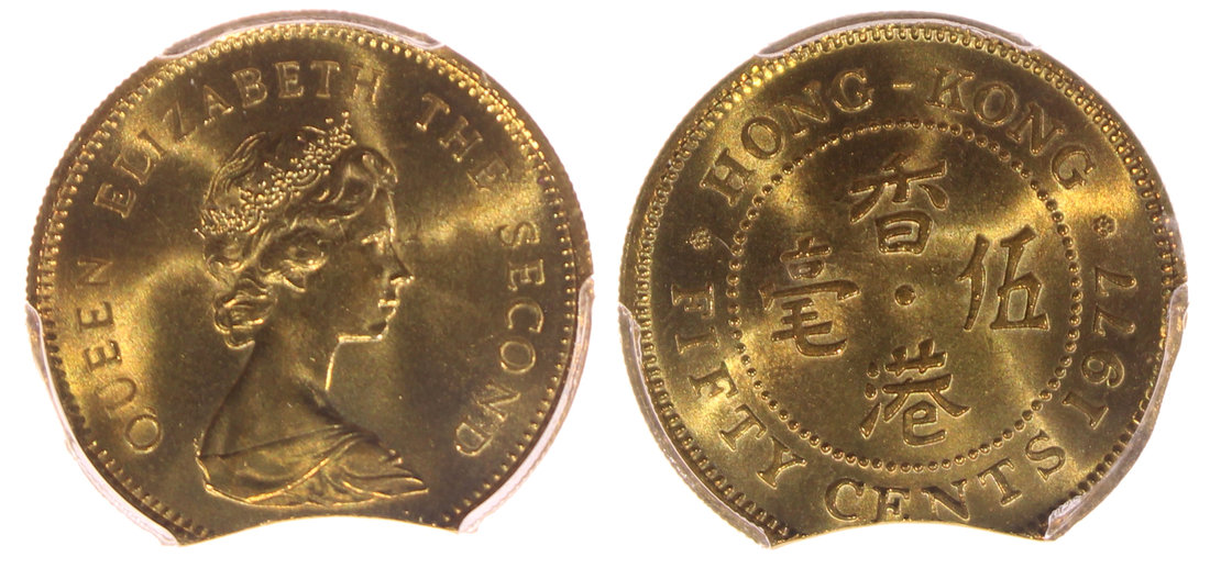 Hong Kong, 50 cents, 1977, Mint Error - Clipped Planchet,