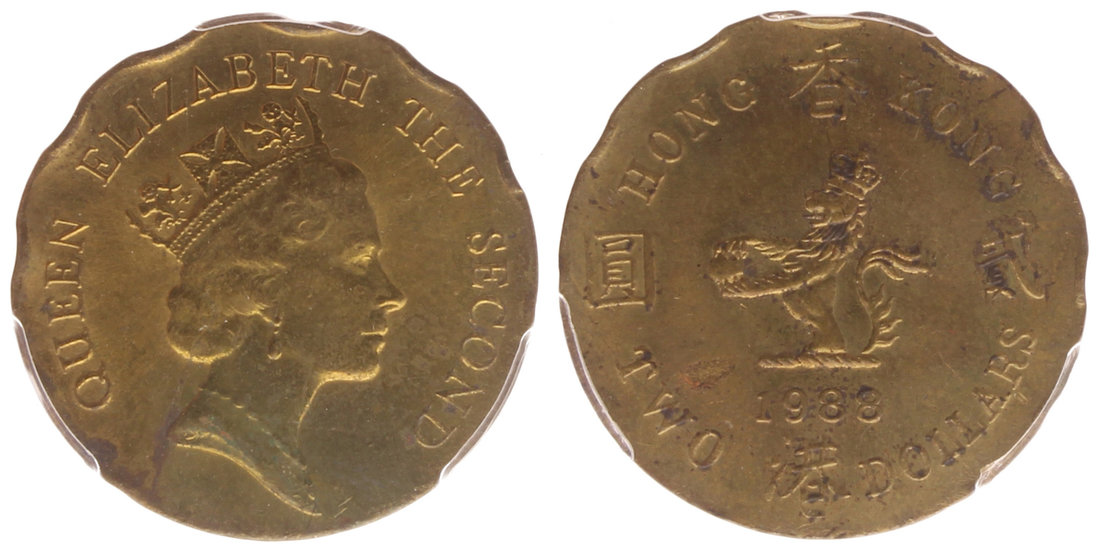 Hong Kong, ERROR COIN, $2, 1988, struck on a brass planchet,