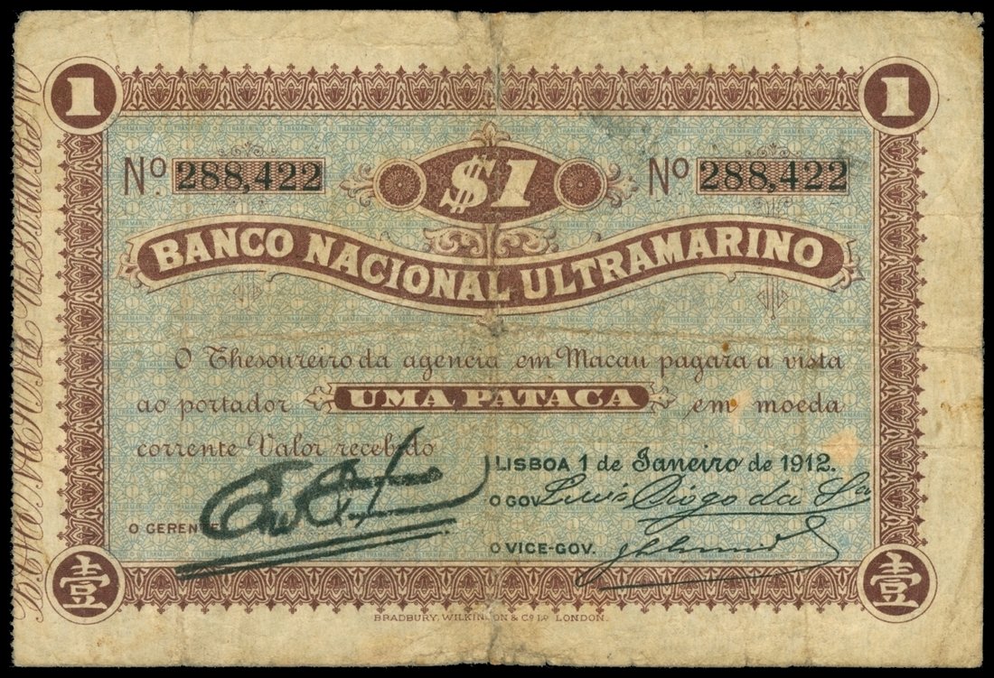 Macau, Banco Nacional Ultramarino, 1 patacas, 1912, serial number 228 422, brown on blue underprint, reverse arms without crown at centre,