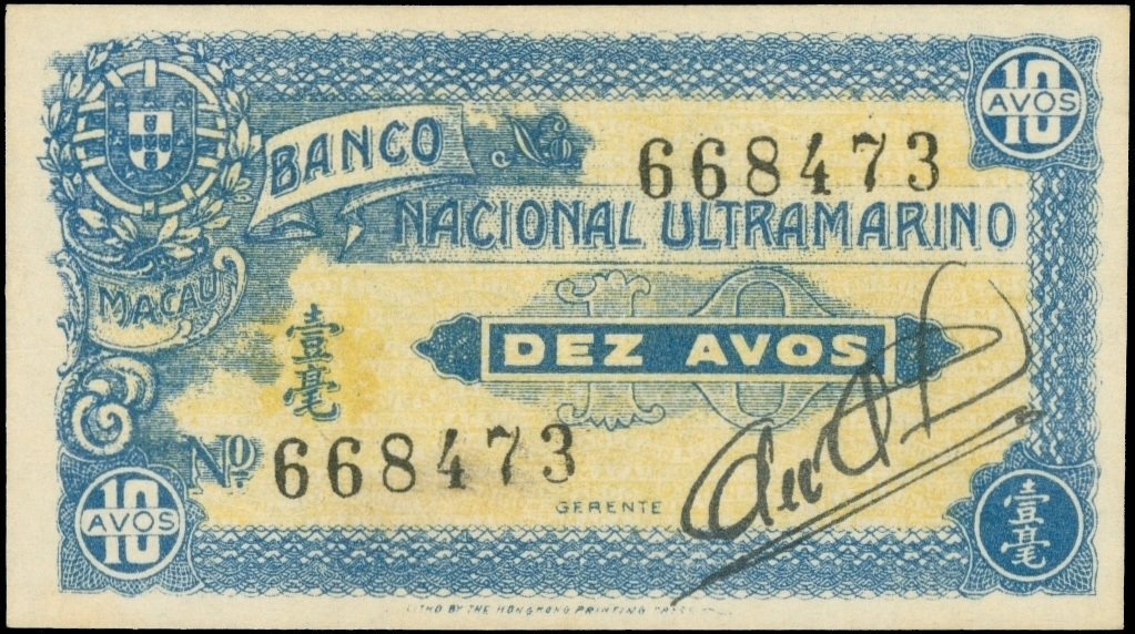 Macau, Banco Nacional Ultramarino, 10 avos, 1944, serial number 668473, blue on yellow underprint, arms at upper left,