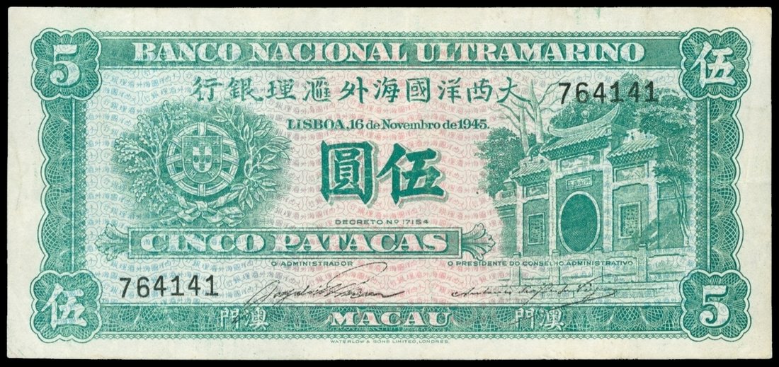 Macau, Banco Nacional Ultramarino, 5 pataca, 16.11.1945, serial number 764141, green on pink and light green underprint, temple at right, arms at left, reverse green with bank ship seal at centre,