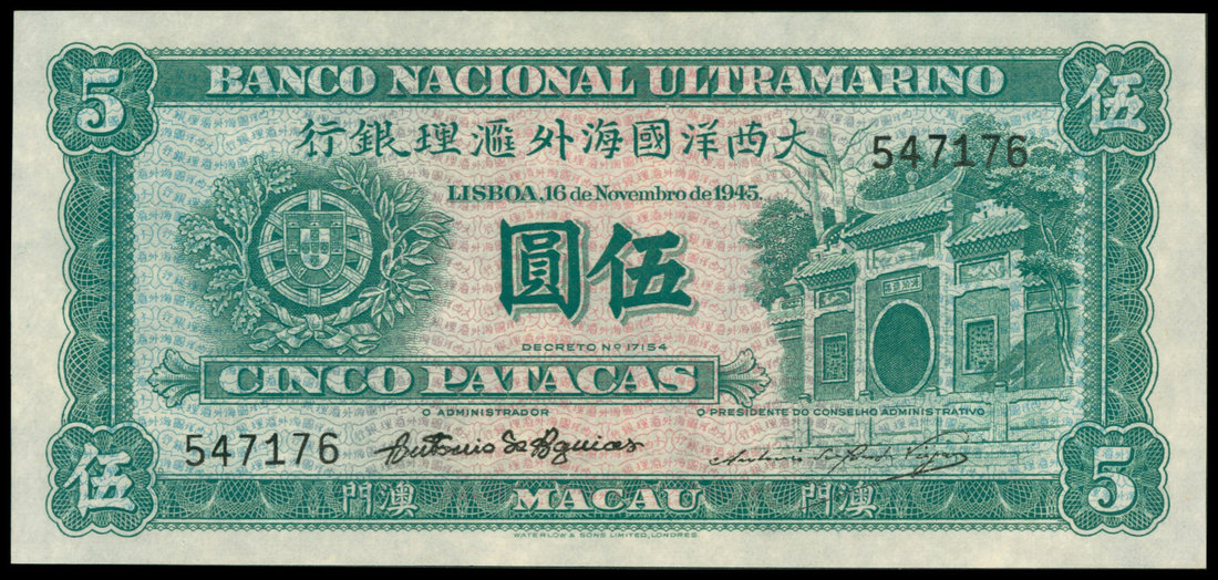 Macau, Banco Nacional Ultramarino, 5 patacas, 16.11.1945, serial number 547176, green on pink, temple at right, value at each corner, reverse greem ship seal at centre,
