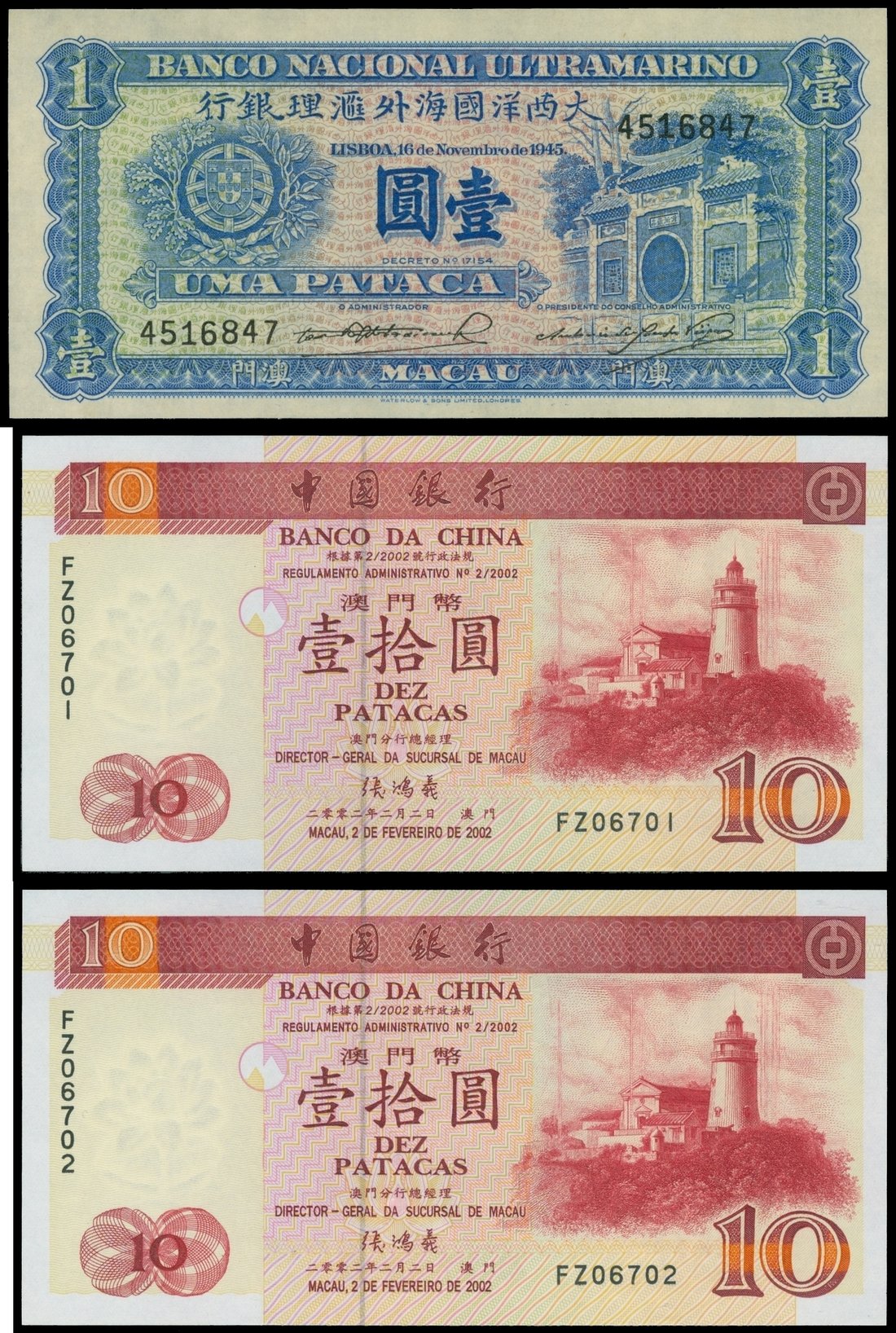 Banco Nacional Ultramarino, group of 3 notes, 1 pataca, 1945 and 2 replacement notes, 10 patacas, 2002, consecutive serial numbers FZ06701 and FZ06702,