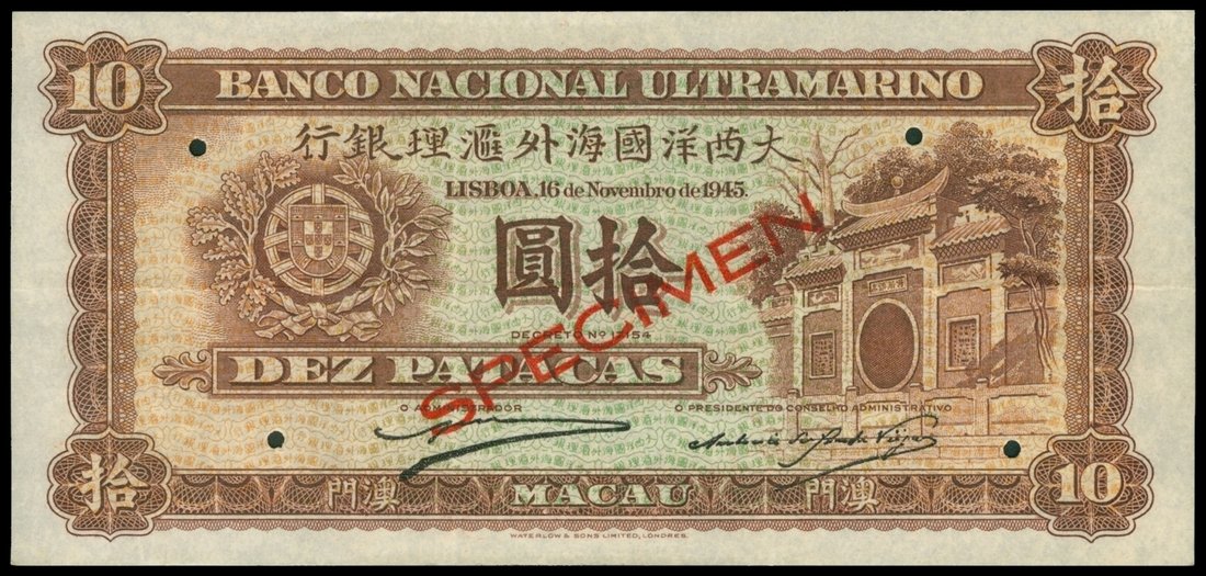 Macau, Banco Nacional Ultramarino, 10 patacas, specimen, 1945, brown on light green underprint, temple at right, arms at left, red ‘SPECIMEN’ overprinted, reverse brown,