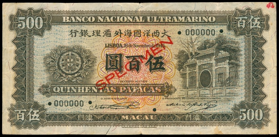Macau, Banco Nacional Ultramarino, 500 patacas, specimen, 1945, serial number 000000, brown, temple at right, reverse shows steamship seal at centre,