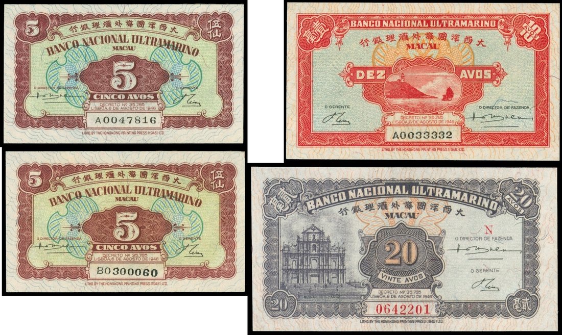 Macau, Banco Nacional Ultramarino, group of 4 fractional notes, 1946, 5 avos (2), 10 avos and 20 avos, red-brown, red and violet respectively,