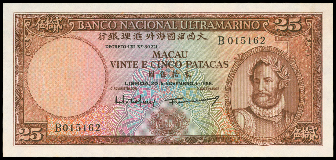 Macau, Banco Nacional Ultramarino, 25 patacas, 20.11.1958, serial number B 015162, brown on mluticolour, Luis De Camoes at right, watermark at left, the reverse shows the bank's ship seal and a maiden watching departing ships,